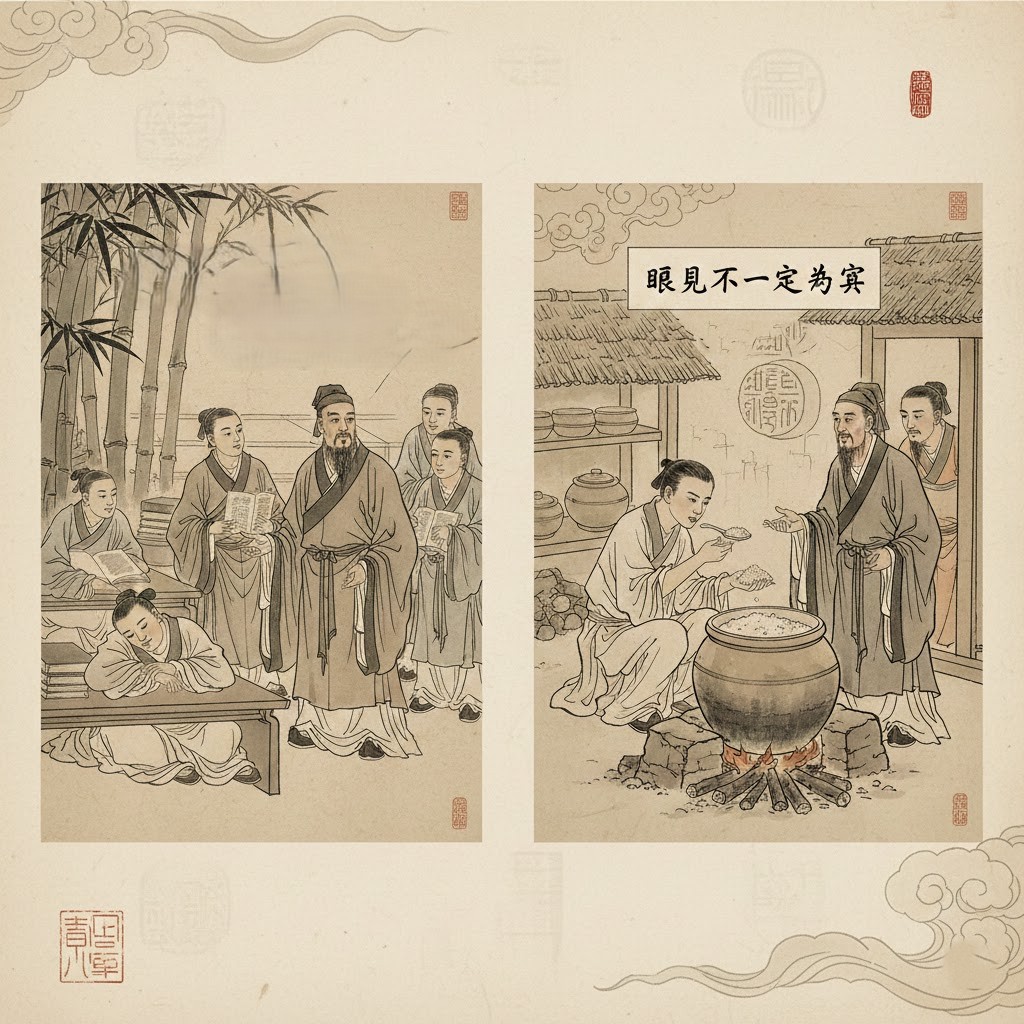 2. 眼见不一定为实:当子贡看到颜回“偷吃”锅里的米饭时,心中起了疑心。然而真相是,颜回为了不浪费掉进灰尘的粮食,才先吃掉了弄脏的部分。孔子借此提醒:不能仅根据表象下判断,必须用心去了解真相