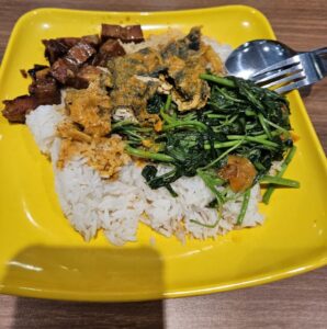I tried something different today. The moment I saw the auntie put the tray of spinach on the panel, I knew I need to get it. Same stuff I get, but just a lil different veggies and mock meat. Curry is an always for me. Their curry with rice is just so good ☺️